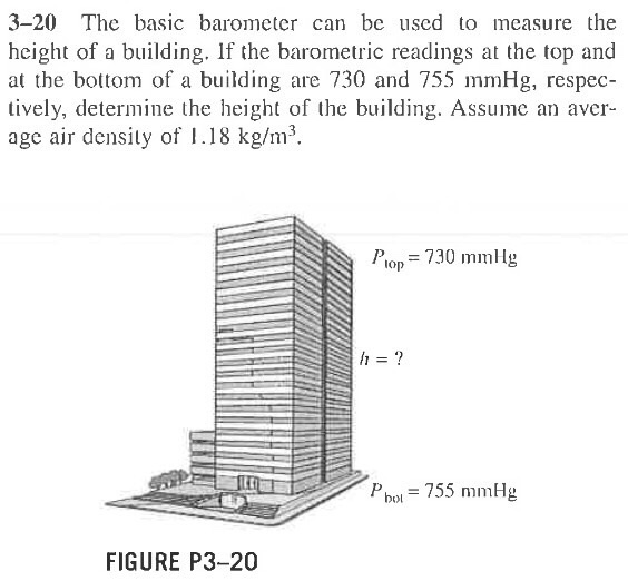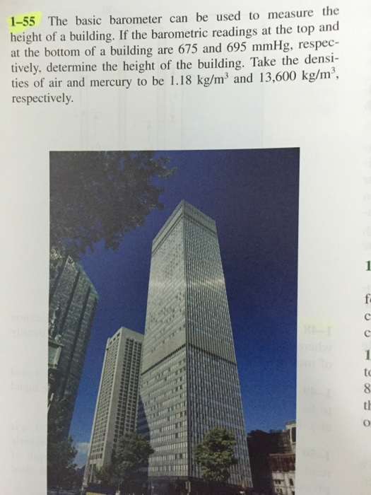 Assume an average air density of. 1. 18 k g / m 3. In this problem we use the basic mercury barometer to determine the height of a building. Consider the case that the barometer reading at the top of the building is 751 mm hg, and at the bottom of the building is 760 mm hg. Assume the density of mercury ρ hg = 13,600 kg/m 3, and that the average. The basic barometer can be used to measure the height of a building. If the barometric readings at the top and at the bottom of a building are 29. 7” and 28. 7” hg, respectively, determine the height of the building in feet. Assume an average air density of 0. 0023 slug/ft3 (1 slug = 32. 174 lb) and sg of hg = 13. 55. The basic barometer can be used to measure the height of a building if the barometric readings at… a: